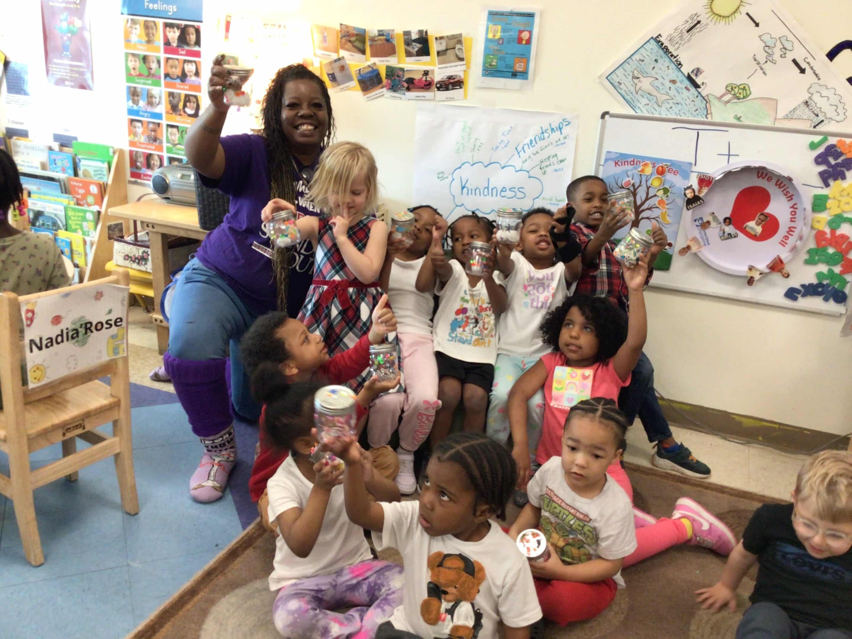 In the Yellow Room where Miss Barbara teaches 3-5 year olds, the tables are lined with kindness jars – vessels in which the students place a cotton ball for every good deed they share that day.